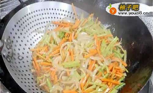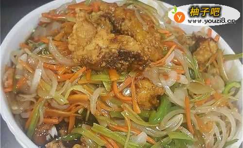 这道菜是鱼肉炸酥,拌上五种蔬菜切成条状,再淋上酸甜酱,酸酸甜甜挑动你的味蕾。