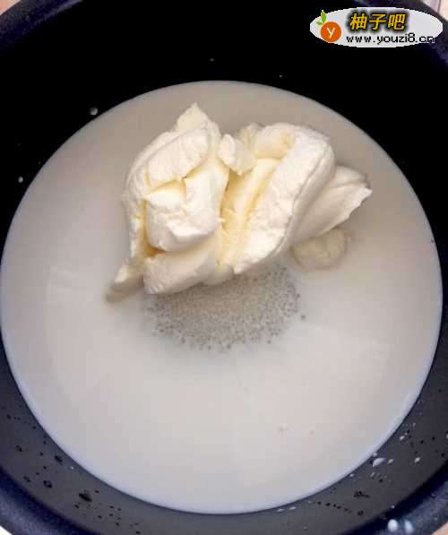 4剩余的牛奶倒进牛奶锅,并加入淡奶油和砂糖,加热;