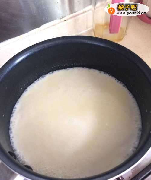 5牛奶烧开后,倒入刚刚准备好的牛奶淀粉浆,用勺子快速搅拌,开始粘稠时就要熄火了;