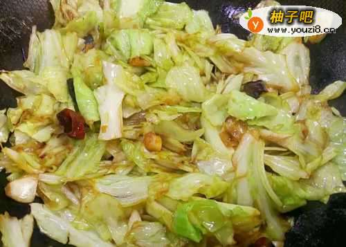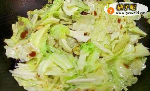 5蚝油炒匀后根据包菜在锅里的势力范围沿锅边再倒一圈醋下去。