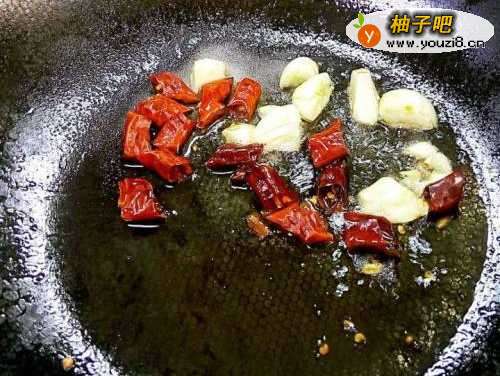 3将油锅烧辣之后,盐炒散调小火放干红椒和蒜爆香,呛香味扑鼻而来,迅速倒包菜入锅大火翻炒,炒炒炒,翻炒大约半分钟左右,如下图: