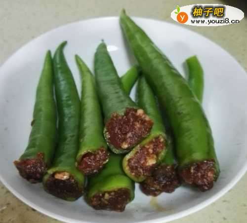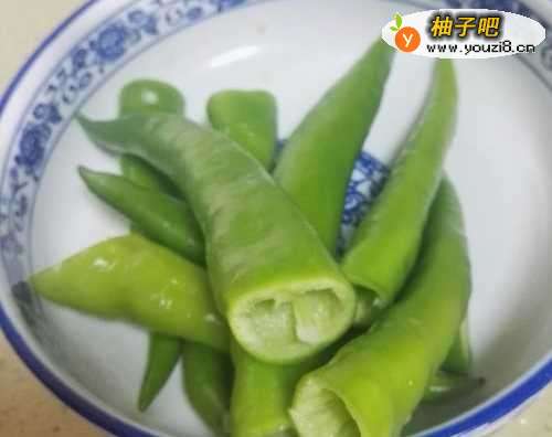 2尖椒切掉蒂,用筷子抠出辣椒籽备用。