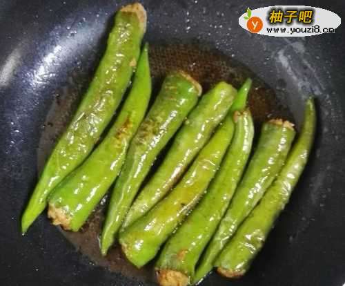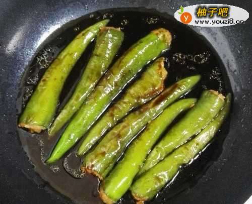4锅中放油,温油放入青椒小火煎青椒大约4分钟,青椒上出现虎皮纹。
