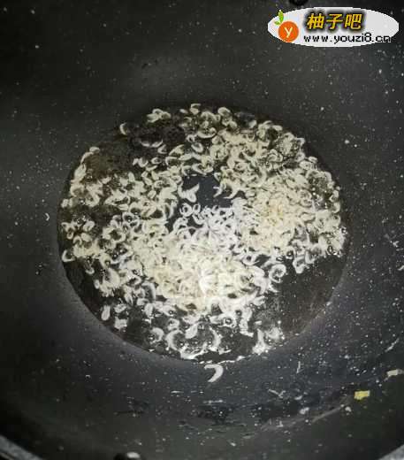 4接下来,往锅里热油加入虾皮炒香。
