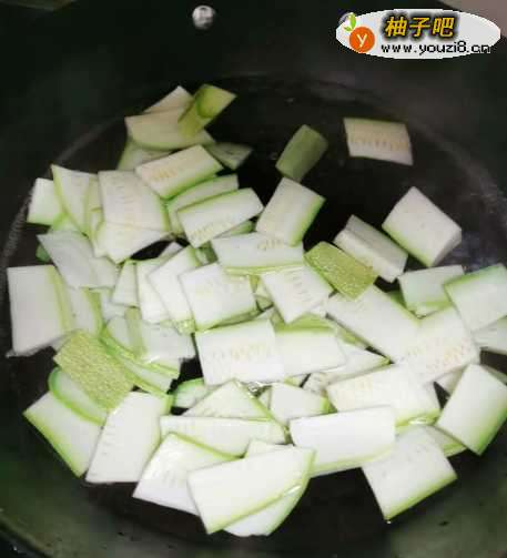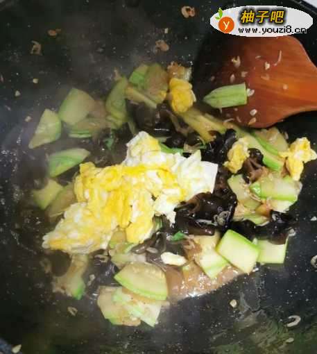 5然后,加入角瓜、木耳进行翻炒。