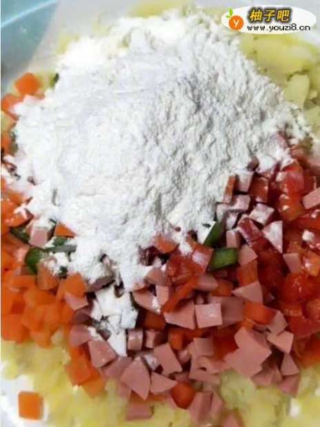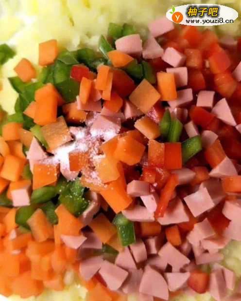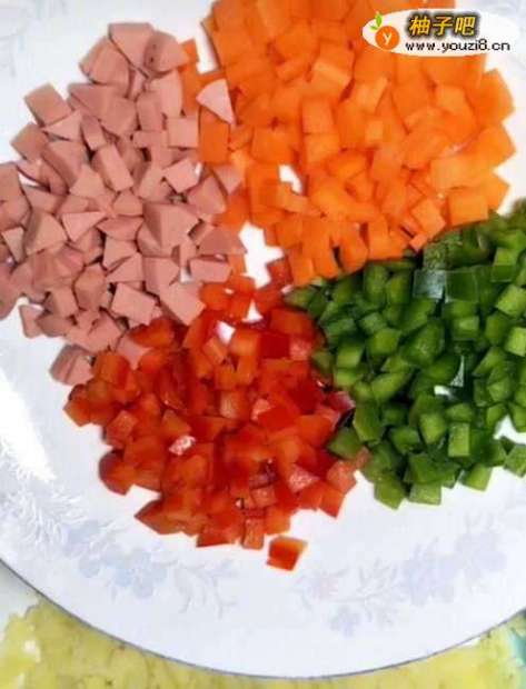 2煮熟的土豆碾压成泥,胡萝卜,青椒,红椒分别洗净切丁,火腿肠切丁