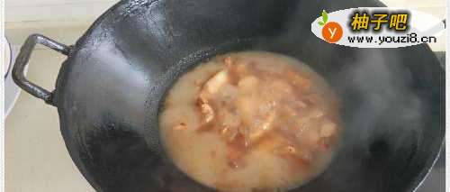 锅中加入60毫升的食用油,将猪肉煸炒至金黄色,倒入800毫升的水。