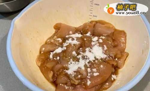 3锅中加入1大匙油中小火烧热,鸡肉下锅前拌入太白粉抓匀