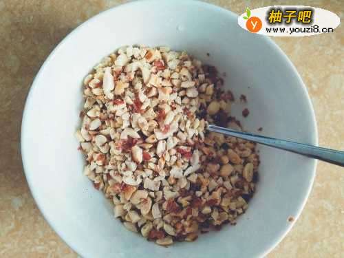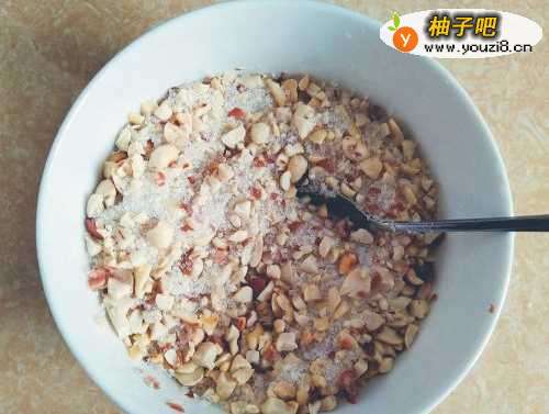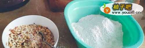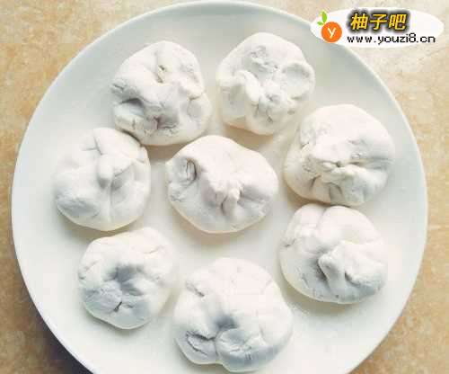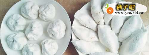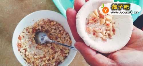 7切成一小团,一小团,捏成饺子皮形状,放入白糖花生馅;