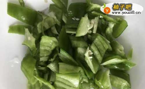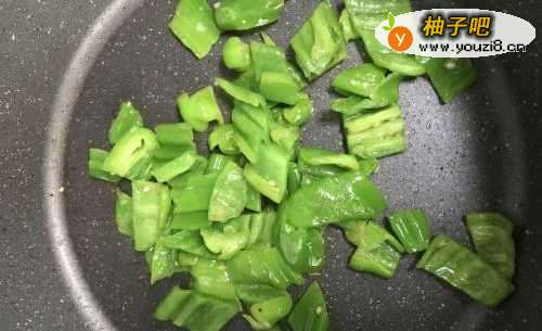 4锅里放点油,放青椒煸炒,炒变色变软后盛起。