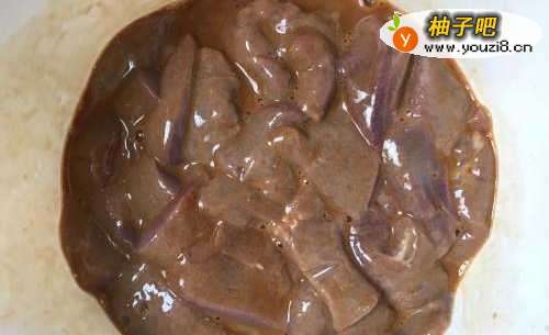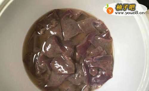 把肝洗干净切片泡水冲洗干净后沥水,放料酒盐腌制半个小时。