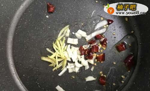 5锅里放油放干辣椒大蒜生姜炒香。