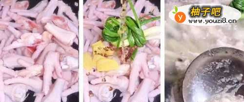 2放入锅里,倒人没过鸡爪的水,加入葱结,姜片、花椒和料酒,煮开后,捞出浮沫,再煮10分钟至能用筷子插透即可。