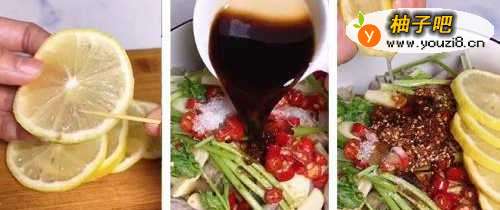 4柠檬洗净,切片,去籽,去头尾,再加入小米椒,姜片,蒜子,香菜,白糖,香醋,生抽,老抽,耗油,盐,辣椒油,最后加上半个柠檬汁,这样更加爽口,感觉自己能用上的调料都用上了。