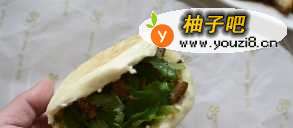 8烙好的饼从中间切块,加入剁碎的卤肉和香菜即可食用