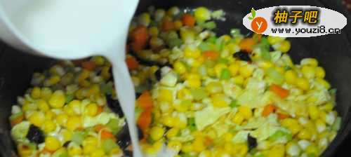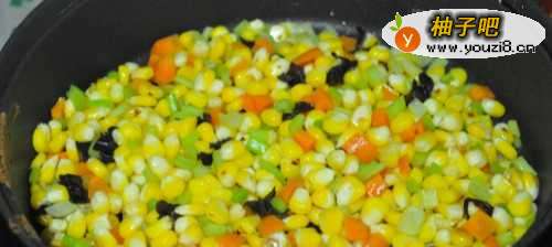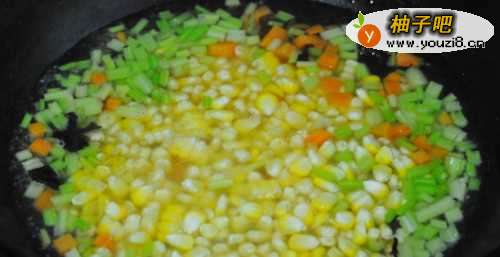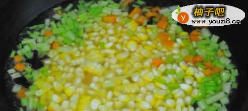 3倒入玉米粒,将它们一起煮至完全熟,捞出后控干水备用。
