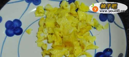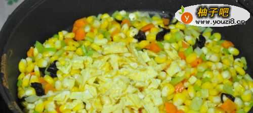 4打人蛋液,加盐调味,倒入锅中煎成蛋卷,切成与玉米差不多大小的颗粒。