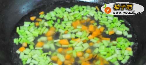 2将一锅水烧开,加入少许盐,将胡萝卜块放入锅中,烫一分钟,加入芹菜段一起烫一分钟。