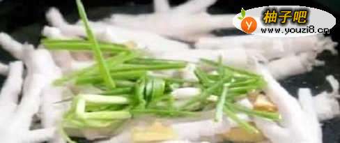 将鸡爪倒入锅中,将鸡爪加水淹过,加入料酒和大葱、姜片煮断生,关火焖3分钟捞出,用清水冲洗干净油脂水不再浑浊,加入冰块快速冷却鸡爪(口感会更好),去掉骨头在用刀把鸡爪一分而二待用。