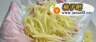 4手上套保鲜袋,取适量土豆丝在手中整成小的圆饼形