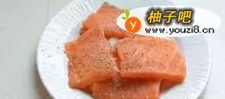 把三文鱼做成切片状,然后加入少量的食用盐和黑胡椒粉