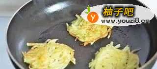 5在平底锅中加适量的橄榄油,油热后将土豆饼放入,用中小火煎好一面后再煎另一面直到二面都焦黄香脆