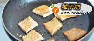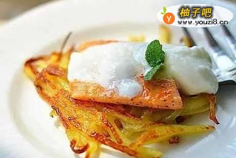 6取出土豆饼之后,再加一点油,把三文鱼放入锅中煎直到两面都熟透。然后把煎好的土豆饼,放一片三文鱼进去,再加一勺酸奶就可以了