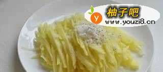 3把土豆丝切成小块,不要洗,再在土豆里加少许盐、生粉和黑胡椒粉,拌匀。