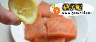 2把柠檬汁挤出水,淋在在三文鱼切片上,把三文鱼和调料抹匀,腌制10分钟