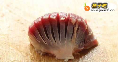 2把鸡胗先横着切成扇形再对半切成2片,再把每片对半切开,