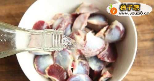 鸡胗洗净,然后放入适量白酒,再冲洗干净沥水;