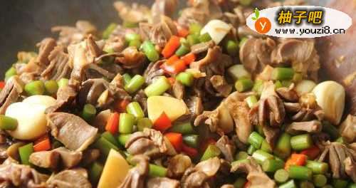 9翻炒均匀,全部鸡胗都上色后放入辣椒翻炒均匀后即可;