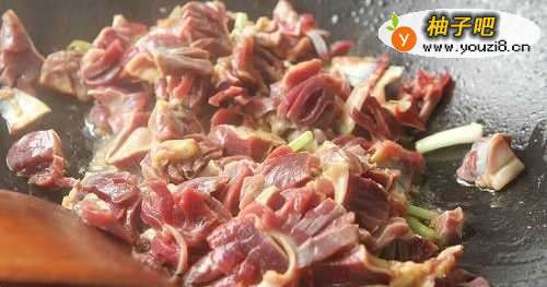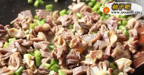 6锅内放入适量油,放入蒜和葱白炒香,然后倒入鸡胗大火爆炒;