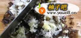 4将肉馅与银木耳放在一起,拌少许芝麻油,盐