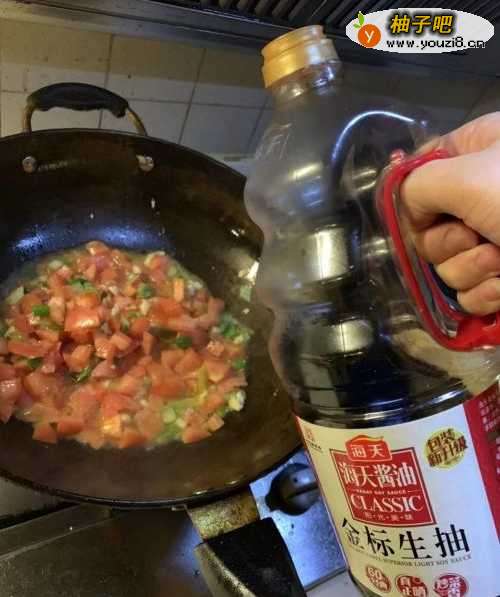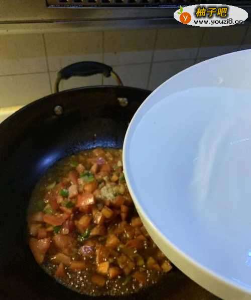 4西红柿翻炒出汁后,倒入一升水