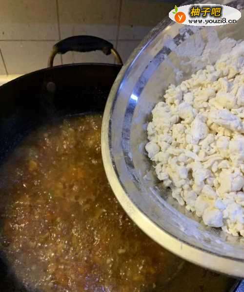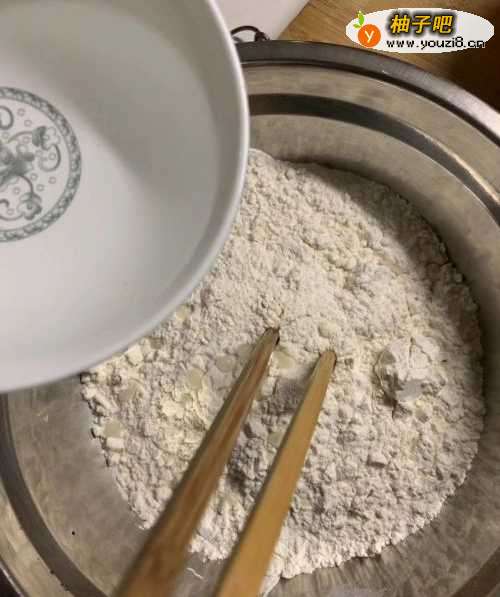 取适量的面粉,边加水(一点点的加)边搅拌,一直到均匀的疙瘩状