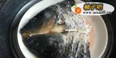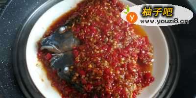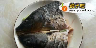 6放入烧开水的锅里大火蒸8分钟,如果鱼头比较大,适当的延长时间,鱼头蒸熟后取出撒上葱花,小锅里放入10克油烧热,淋到鱼头上