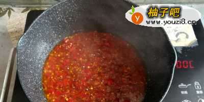 5换一个小锅,烧热后放入10克玉米油,先放姜蒜末小火煸出香味,再加入剁椒翻炒均匀,加入盐、生抽和蚝油调味煮开,煮好的剁椒酱汁淋到鱼头上