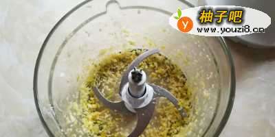 3姜块和剥皮的蒜米放入切碎机里搅打成细小的颗粒,剁椒是买的瓶装的。