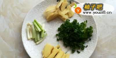 生姜洗净去皮,一半切薄片,一半切小块,香葱洗净,葱白部分切小段,叶子部分切成葱花。