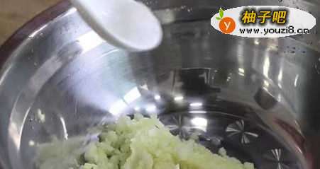 5选3拌蒜,切成蒜碎,放入盘中,依次放入盐、味精、醋、生抽、芝麻香油、香辣红油,配成料汁。