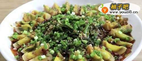 6倒入摆盘好的皮蛋和青椒之中,最好撒上葱花和熟芝麻。