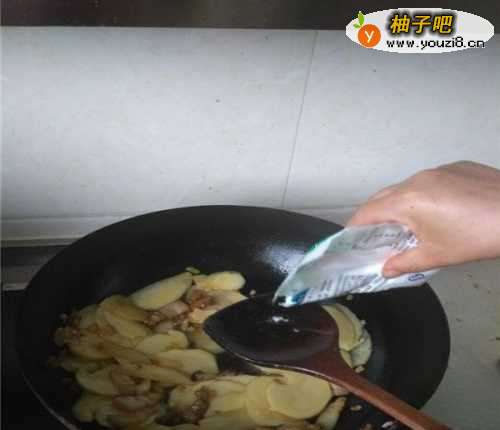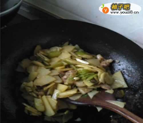 4不要停止翻炒,稍微滴一滴酱油味道会更鲜美。看肉炒得差不多了,已经熟了的话,咱们进行下一步;开始添加土豆片,倒土豆片的时候小心锅里的油溅到自己伤到皮肤。还要注意翻炒,防止猪肉烧焦贴锅