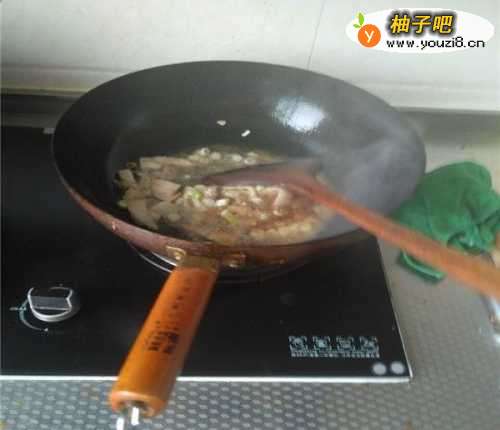 3准备好主菜的食材之后,先开火;然后往锅里倒油,我倒的是植物油,油只要不沾锅就可以,不需要倒太多。先让锅里的油烧热,之后才能下锅放菜。先放的是猪肉,用炒铲翻炒一会,以免把肉炒糊了;接着把切碎的葱花也放进去,进行炒香,这个阶段如果家里有牙口不好的老爷爷老奶奶的话添一些水,炖一会