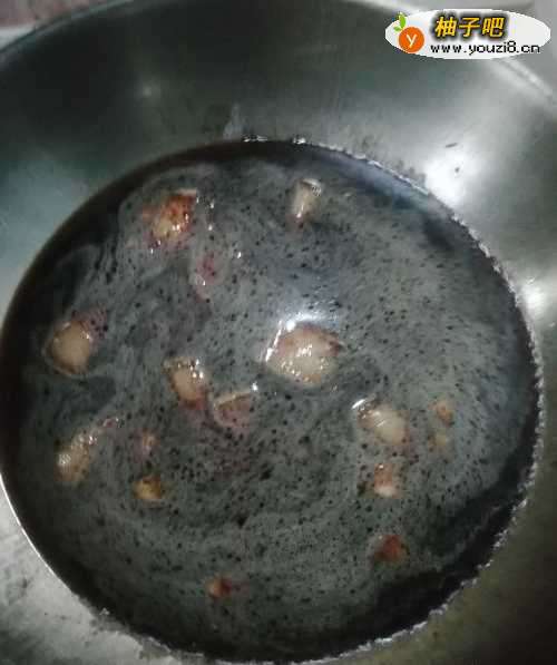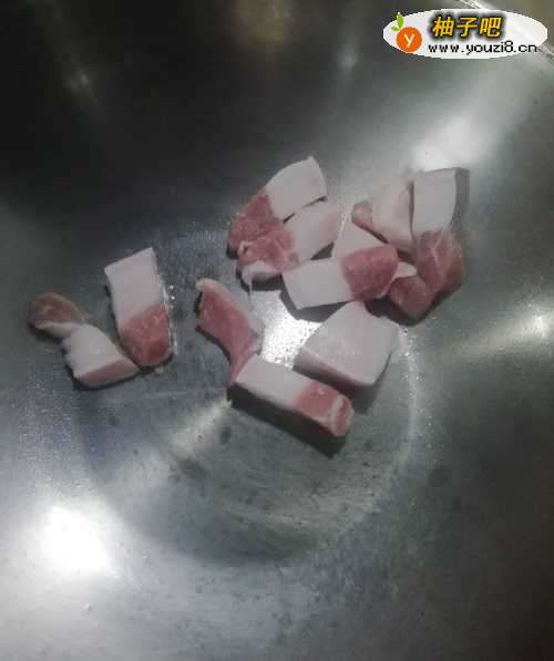 4点火把锅中加热,锅里冒烟之后放入肥肉炼油。