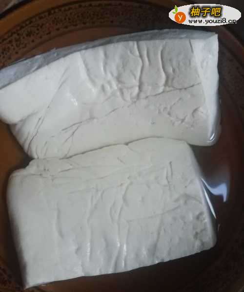 2市场上购买二块豆腐,最好焯一下水,如果嫌麻烦开水泡一下也可以。
