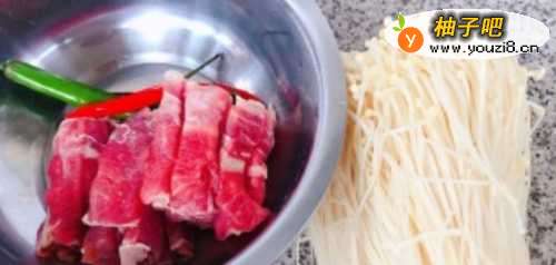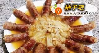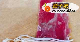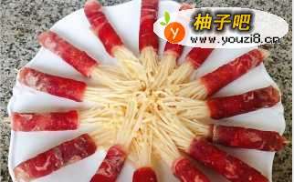2肥牛片展开取出适量金针菇放在肥牛的一侧。