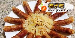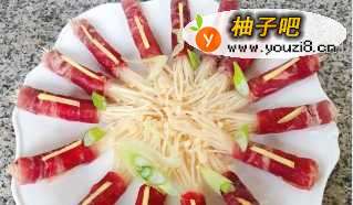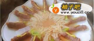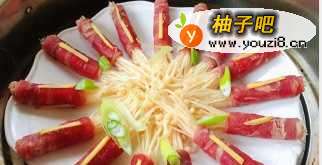 8肥牛金针菇卷拣去葱姜摆入另一个盘中。
