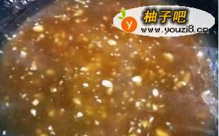 9蒸肥牛金针菇卷的原汁原味汤汁倒入锅中再添加适量清水烧开放入蚝油、一品香酱油、糖开锅时倒入水淀粉搅拌成粘稠状最后撒上蒜粒即可