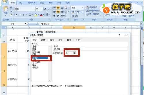 6选择【数字】→【百分比】,并设置小数位数为2位。